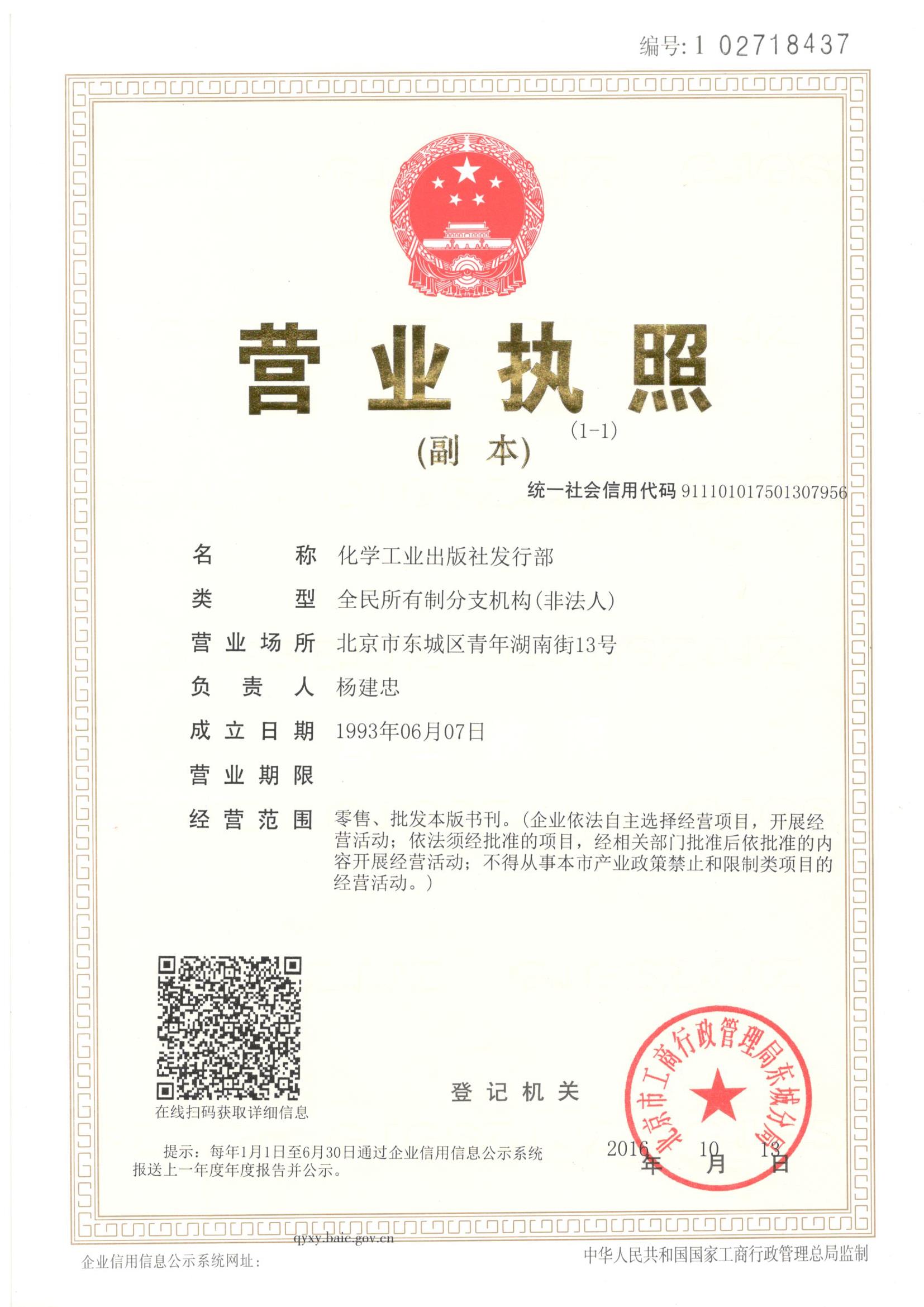 2018 © 化學(xué)工業(yè)出版社有限公司. ALL Rights Reserved. 京ICP備12046843號(hào)-7 | 京公網(wǎng)安備 11010102000557號(hào) | 網(wǎng)絡(luò)出版服務(wù)許可證 | 出版物經(jīng)營(yíng)許可證副本 | 出版物營(yíng)業(yè)執(zhí)照副本