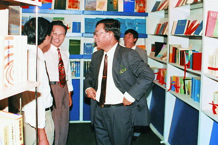 于1996年(時(shí)任化學(xué)工業(yè)部黨組副書記、副部長(zhǎng))視察化學(xué)工業(yè)出版社圖書展臺(tái)